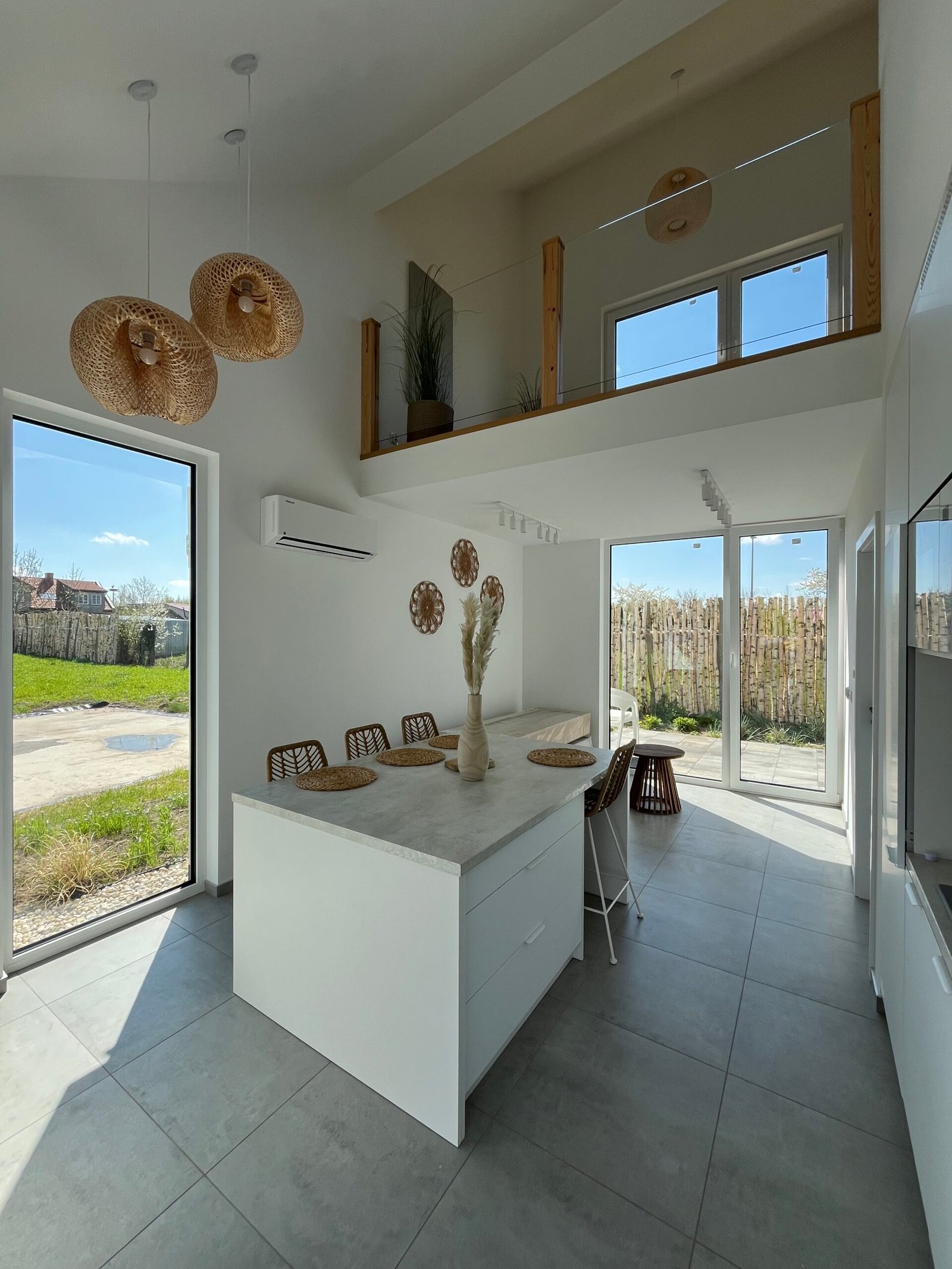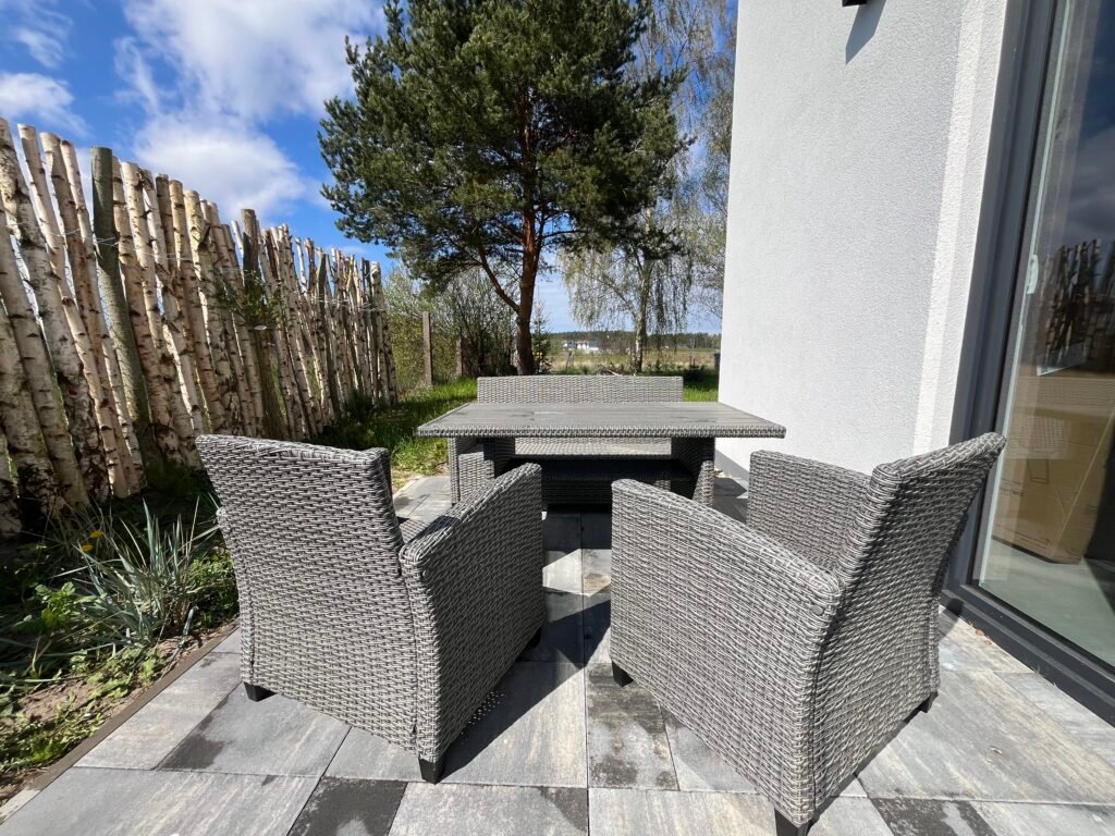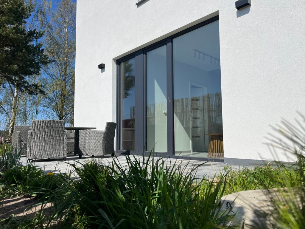Całoroczny murowany domek w otoczeniu zieleni nadmorskiej roślinności. Obszerne przeszklenia zapewniają dużą dawkę światła dziennego i piękny widok na otaczający go ogród. Domek posiada oddzielną sypialnię z łóżkami dla dwóch osób, łoże małżeńskie na przestronnej antresoli oraz sofę z funkcją spania w salonie, co stanowi przestrzeń dla noclegu maksymalnie 6 osób. W pełni wyposażona kuchnia z dużą wyspą umożliwia komfortowe przygotowanie posiłków i celebrowanie rodzinnego czasu. Domek jak najbardziej sprawdzi się przy dłuższych nadmorskich pobytach, wyposażony jest w pralkę, zmywarkę oraz klimatyzację. Jego dużym atutem jest rozbudowana część tarasowa, gdzie można w spokoju wypić kawę i zjeść pyszny posiłek. Dodatkowo otacza go duża przestrzeń zielonej działki, na której swobodnie mogą wyszaleć się dzieciaczki lub Twój pupil.